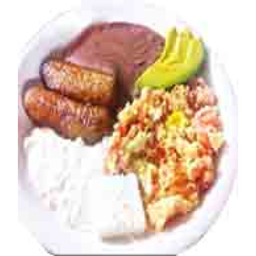 Salvadoran Breakfast served with refried beans, sweet plantain, hard cheese, sour cream and home made tortillas.