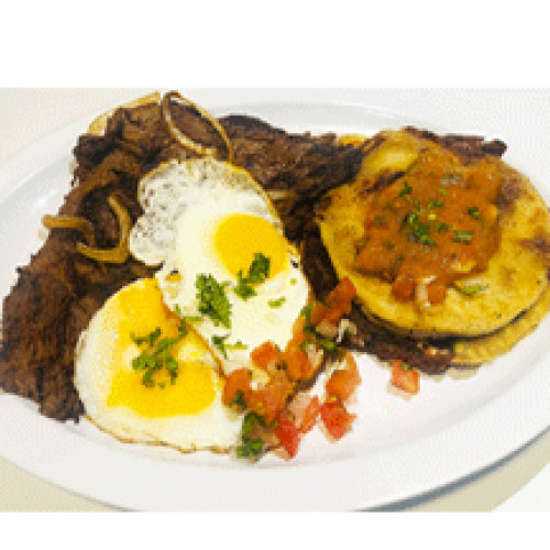 2 chicharron and cheese pupusas, sliced steak and eggs, pico de gallo and salsa.